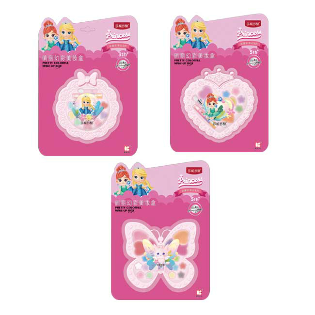 产品: 圆款:6色眼影膏,2色腮红膏,1色闪粉唇彩,3色唇膏,2只化妆刷 ;心款:4色眼影膏,3色腮红膏,1色闪粉唇彩,3色唇膏,2只化妆刷 ; 蝴蝶款:8色眼影膏,4色腮红膏,4色闪粉唇彩,2色唇膏,2只化妆刷