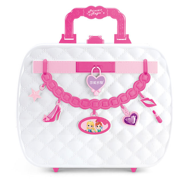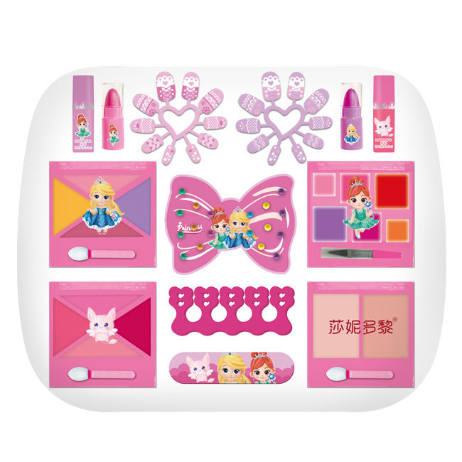 产品: 4色眼影膏,4色腮红膏,6色唇彩,4色粉饼膏,2只指甲油,2只唇膏,2只指甲圈,1片宝石贴,1只EVA 分指器,1指甲锉,4只化妆刷,1只手提箱(不带灯)